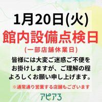1月20日(火)は2か月に1回の館内定期メンテンスの為、一部店舗休業させていただきます。 皆様には大変ご不便、ご迷惑をおかけしますがご理解の程よろしくお願いいたします。 営業店舗及び休業店舗は下記の通りです。 尚、全ての …