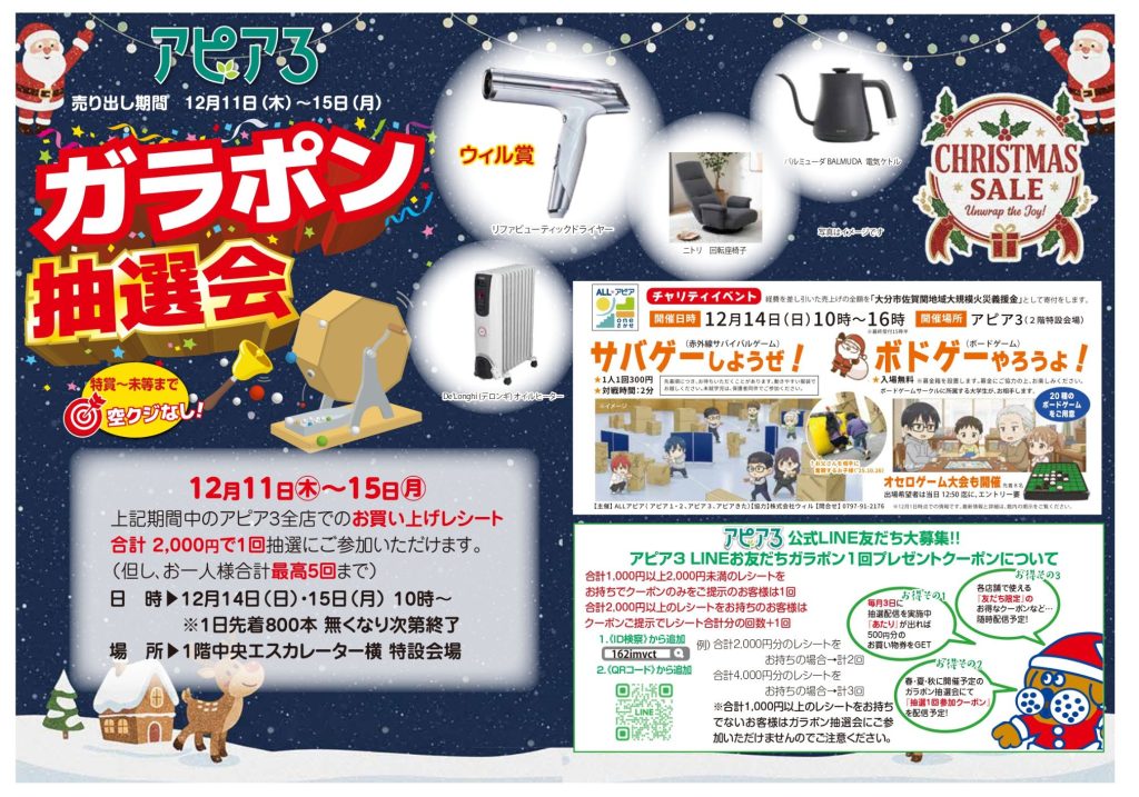 セール期間中のアピア3でのお買い上げレシート合計2,000円で1回抽選会にご参加いただけます。