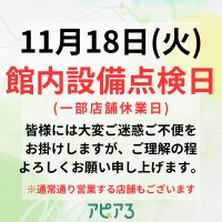 11月18日(火)は2か月に1回の館内定期メンテンスの為、一部店舗休業させていただきます。 皆様には大変ご不便、ご迷惑をおかけしますがご理解の程よろしくお願いいたします。 営業店舗及び休業店舗は下記の通りです。 尚、全て …